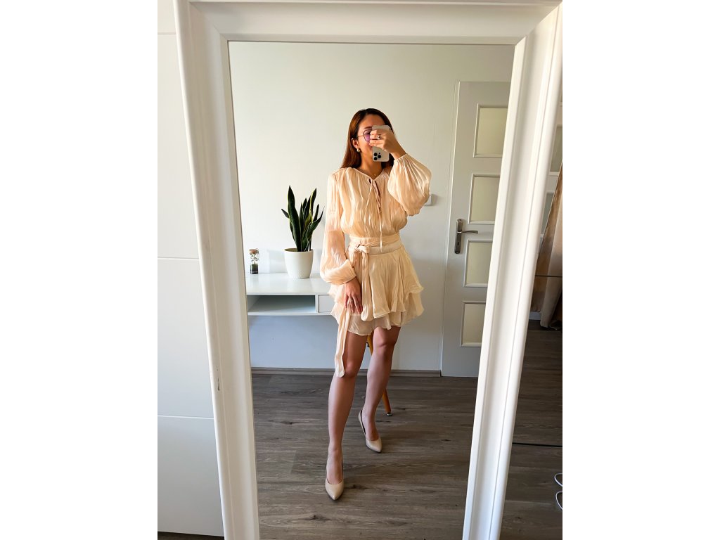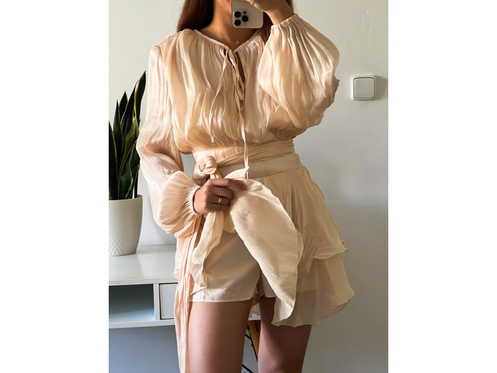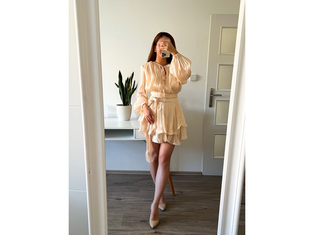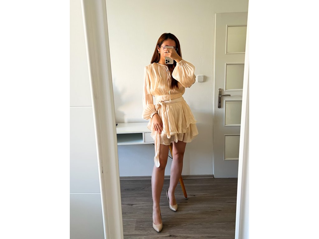 Romantické šaty v odstínu champagne s jemnými volánky a balonovými rukávy. Mají všité kraťasy pro maximální pohodlí a působí elegantně, hravě i luxusně zároveň.