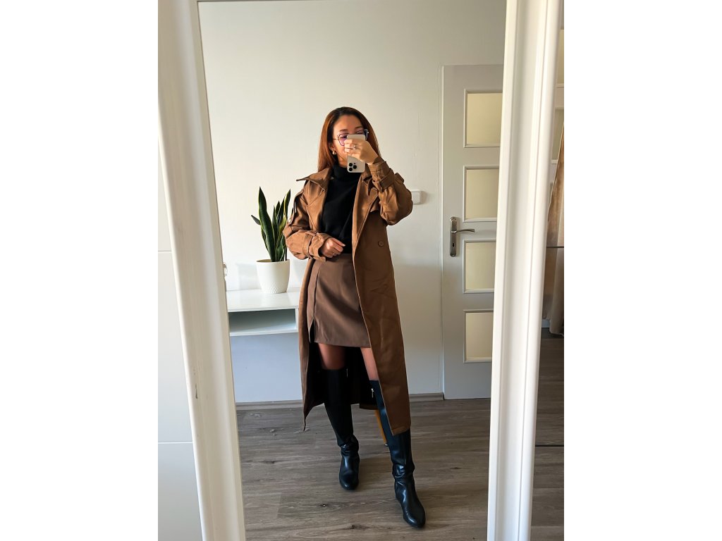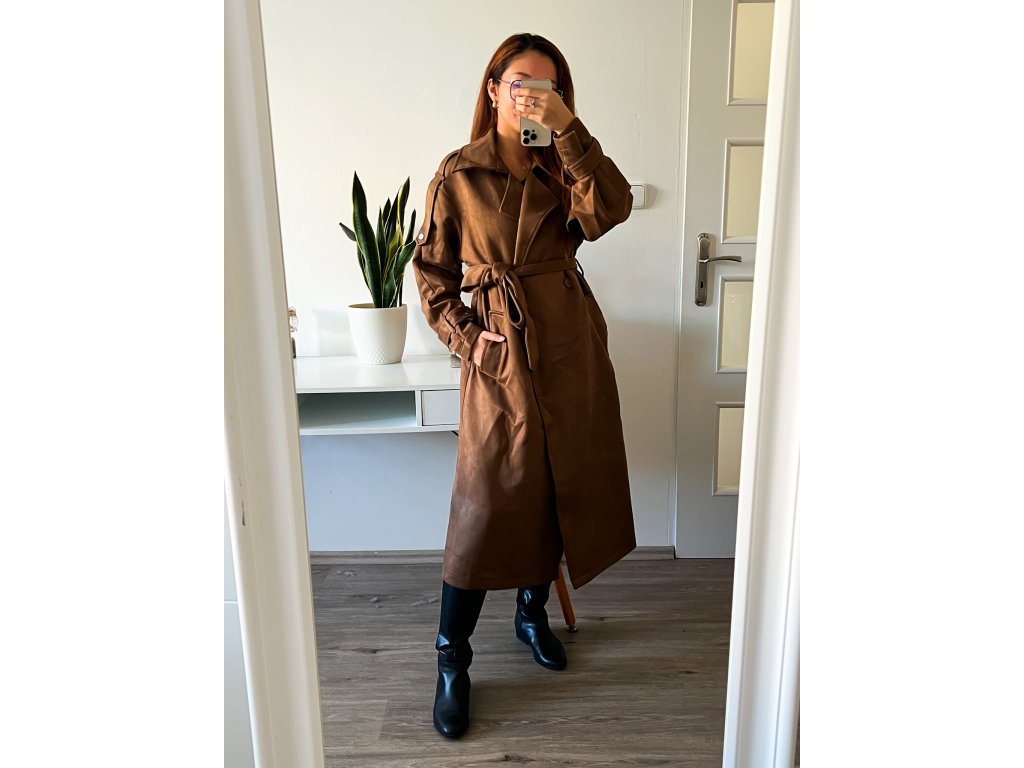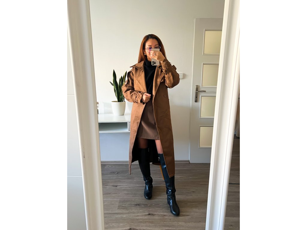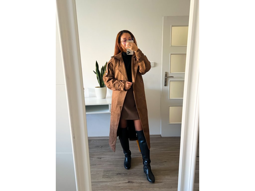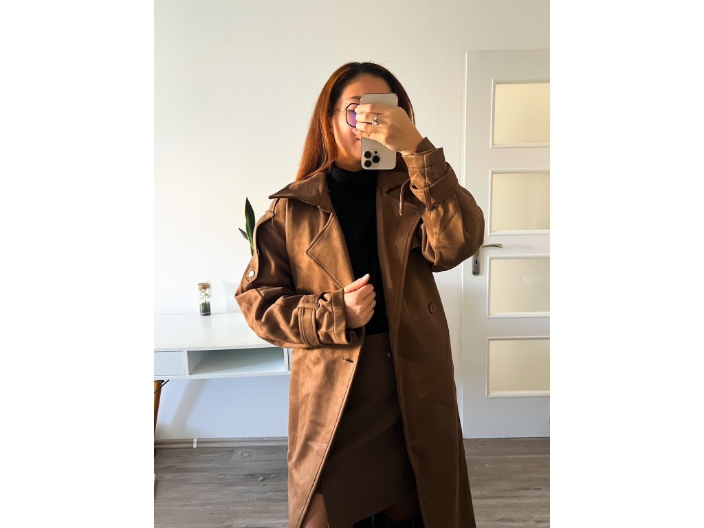 🤎Stylový semišový kabát v teplém odstínu coffee brown s páskem v pase, který krásně zvýrazní siluetu. Jednovrstvý bez podšívky, ideální na podzimní vrstvení nebo lehké přechodové období. Vhodný pro elegantní i casual outfit