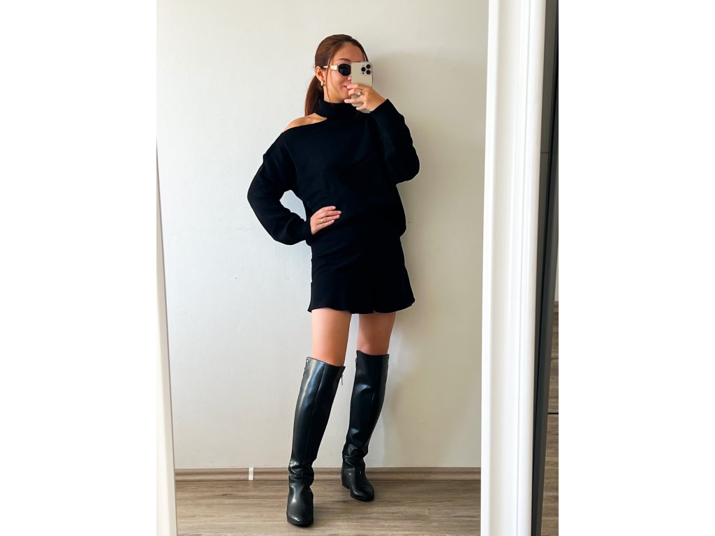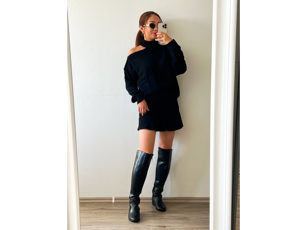 Trendy černý svetr s cut-out detailem na ramenou, který dodává klasickému střihu odvážný nádech. Skvěle se kombinuje s kozačkami i džínami pro moderní a chic look.