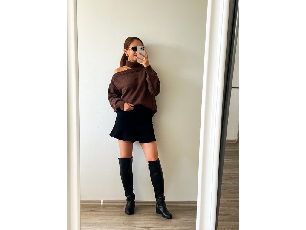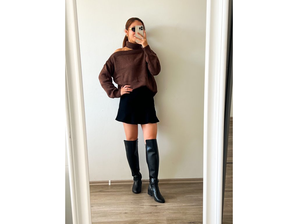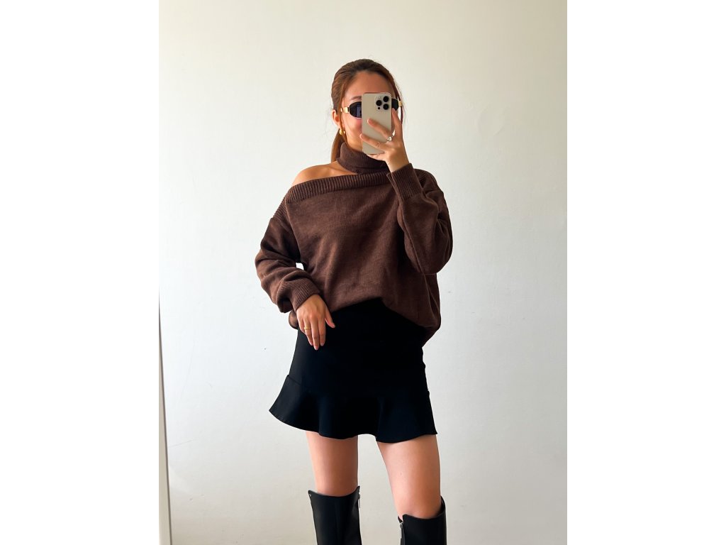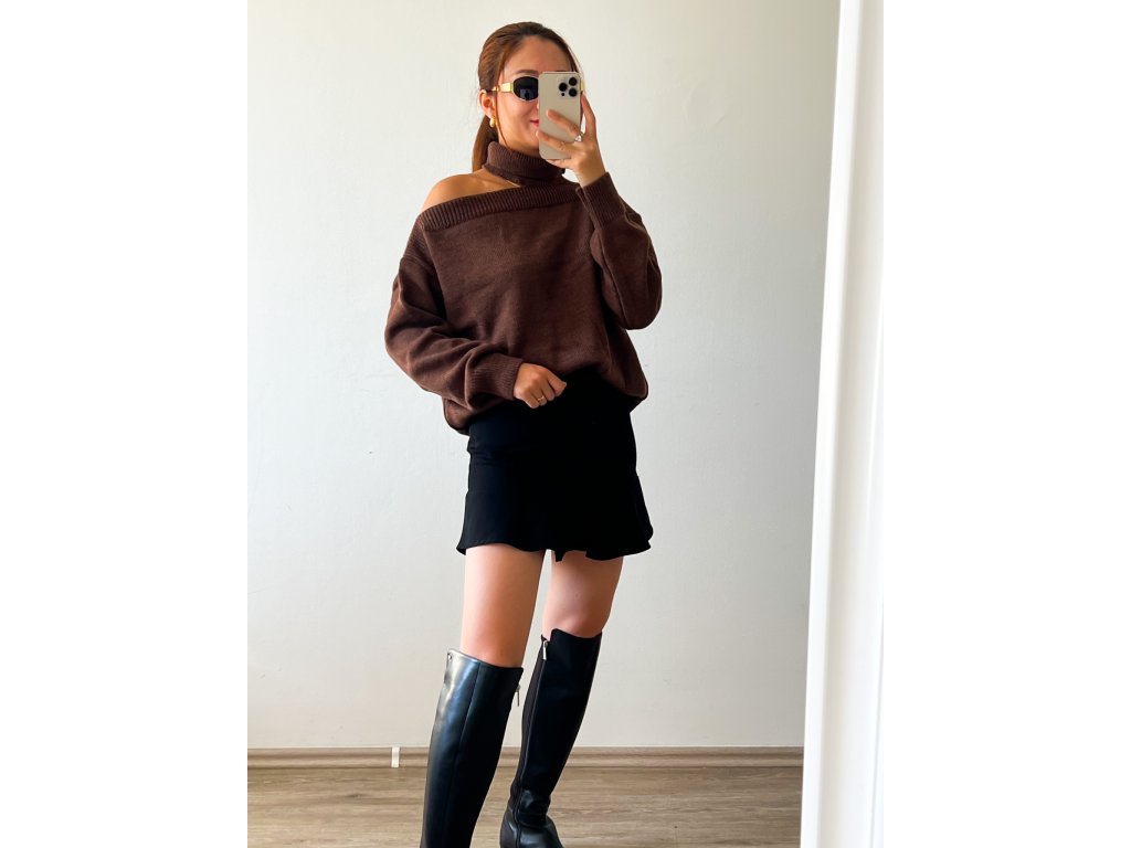 Trendy hnědý svetr s cut-out detailem na ramenou, který dodává klasickému střihu odvážný nádech. Skvěle se kombinuje s kozačkami i džínami pro moderní a chic look.